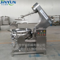 该设备主要由锅体、架体、搅拌系统、加热系统、调速传动装置、搅拌轴、锅体翻转系统等组成,采用一次冲压成型的半球形不锈钢锅体,采用蒸汽、液化气、天然气等加热形式,搅拌方式采用特殊的倾斜式传动,使用的行星式搅拌器与锅体充分接触,实现传动公转与自转的不整数传动比,使锅内无搅拌死角。使用先进的传动与密封结构,使传动部分与锅内洁净、卫生。采用变频调速动力,运行更平稳。采用液压升降,翻锅运料,免拆装搅拌器,节省人力,降低劳动强度,是性能优良的食品加工设备。